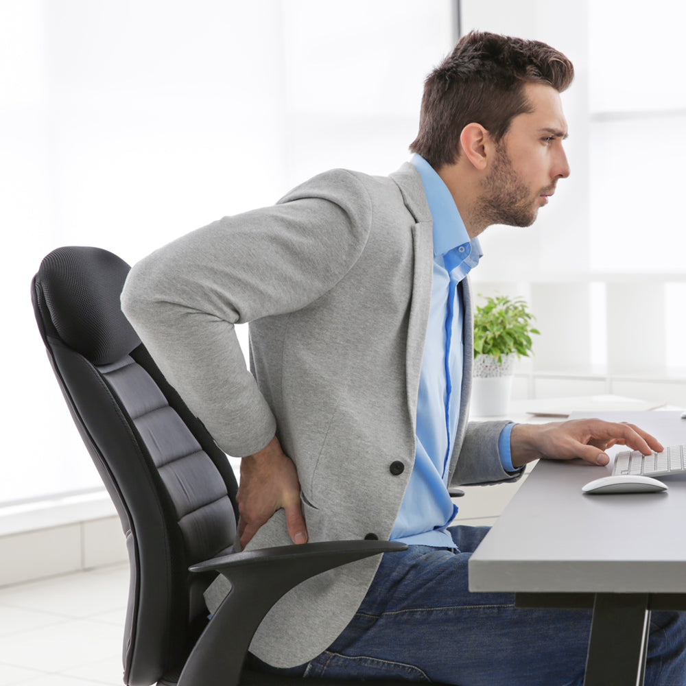 Slip your hand behind your lower back. If there's more than a hand's thickness, tighten your stomach to flatten the curve in your back. If there's too little space, arch your back so that your hand fits. This is your ideal posture. Put both feet on the floor or a footrest, keeping your knees level with your hips. Tuck your chin slightly so the top of your head points toward the ceiling. Square the small of your back against the back of the chair. If you need more support, put a rolled towel or cushion behind your lower back.